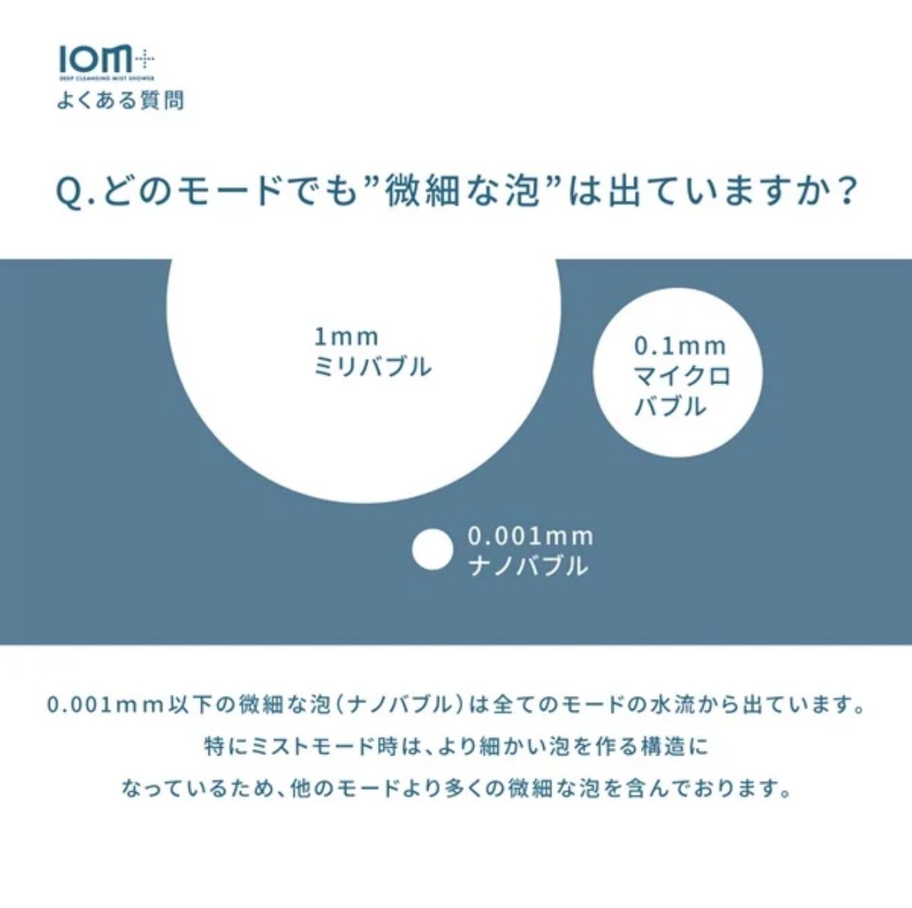 イオムプラスのミストシャワーから 1ml あたり 約2.38億個 放出される大量の「ナノバブル」が、お肌のしわや毛穴の中まで届いて、皮脂汚れやメイク汚れを吸着しながらしっかり洗浄します。